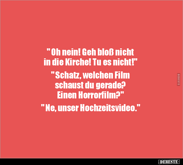 " Oh nein! Geh bloß nicht in die Kirche! Tu es nicht!" " Schatz, welchen Film schaust du gerade? Einen Horrorfilm?" " Ne, unser Hochzeitsvideo."