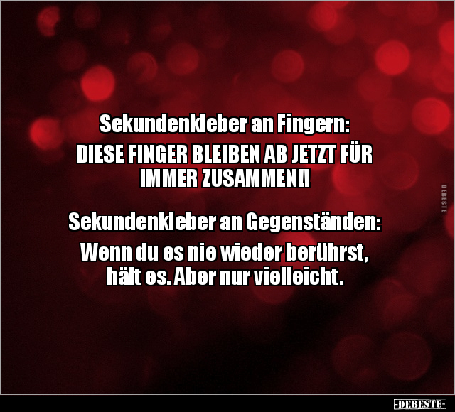 Sekundenkleber an Fingern: DIESE FINGER BLEIBEN AB JETZT FÜR IMMER ZUSAMMEN!! Sekundenkleber an Gegenständen: Wenn du es nie wieder berührst, hält es. Aber nur vielleicht.