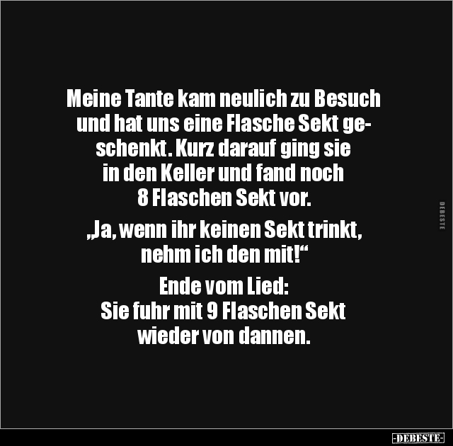 Meine Tante kam neulich zu Besuch und hat uns eine Flasche Sekt ge- schenkt. Kurz darauf ging sie in den Keller und fand noch 8 Flaschen Sekt vor. „Ja, wenn ihr keinen Sekt trinkt, nehm ich den mit!“ Ende vom Lied: Sie fuhr mit 9 Flaschen Sekt wieder von dannen.