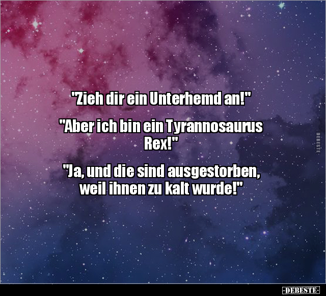 "Zieh dir ein Unterhemd an!" "Aber ich bin ein Tyrannosaurus Rex!" "Ja, und die sind ausgestorben, weil ihnen zu kalt wurde!"