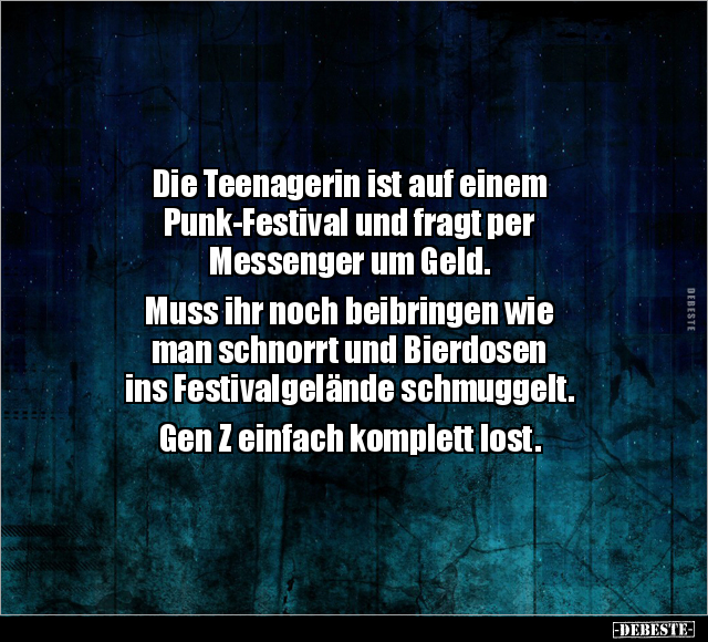 Die Teenagerin ist auf einem Punk-Festival und fragt per Messenger um Geld. Muss ihr noch beibringen wie man schnorrt und Bierdosen ins Festivalgelände schmuggelt. Gen Z einfach komplett lost.