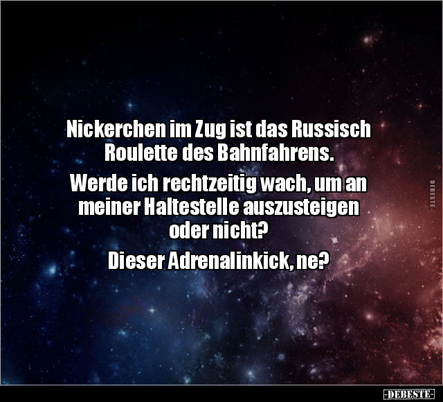 Nickerchen im Zug ist das Russisch Roulette des Bahnfahrens. Werde ich rechtzeitig wach, um an meiner Haltestelle auszusteigen oder nicht? Dieser Adrenalinkick, ne?