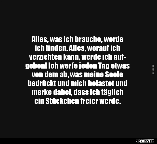 Alles, was ich brauche, werde ich finden. Alles, worauf ich verzichten kann, werde ich auf- geben! Ich werfe jeden Tag etwas von dem ab, was meine Seele bedrückt und mich belastet und merke dabei, dass ich täglich ein Stückchen freier werde.