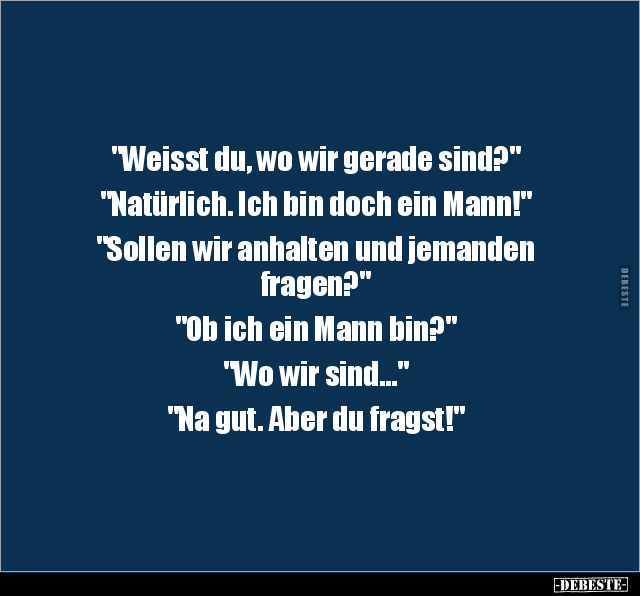 "Weisst du, wo wir gerade sind?" "Natürlich. Ich bin doch ein Mann!" "Sollen wir anhalten und jemanden fragen?" "Ob ich ein Mann bin?" "Wo wir sind..." "Na gut. Aber du fragst!"