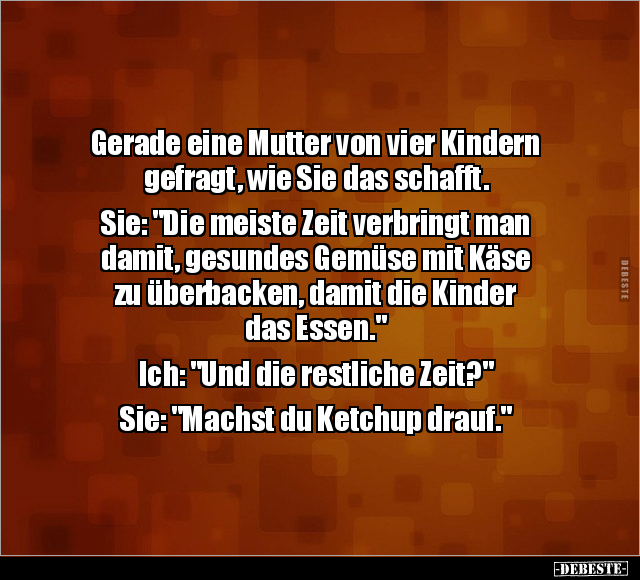 Gerade eine Mutter von vier Kindern gefragt, wie Sie das schafft. Sie: "Die meiste Zeit verbringt man damit, gesundes Gemüse mit Käse zu überbacken, damit die Kinder das Essen." Ich: "Und die restliche Zeit?" Sie: "Machst du Ketchup drauf."