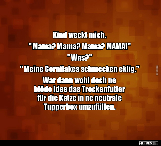 Kind weckt mich. " Mama? Mama? Mama? MAMA!" " Was?" " Meine Cornflakes schmecken eklig." War dann wohl doch ne blöde Idee das Trockenfutter für die Katze in ne neutrale Tupperbox umzufüllen.