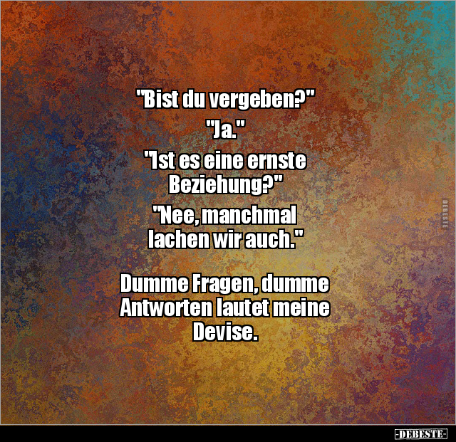 "Bist du vergeben?" "Ja." "Ist es eine ernste Beziehung?" "Nee, manchmal lachen wir auch." Dumme Fragen, dumme Antworten lautet meine Devise.