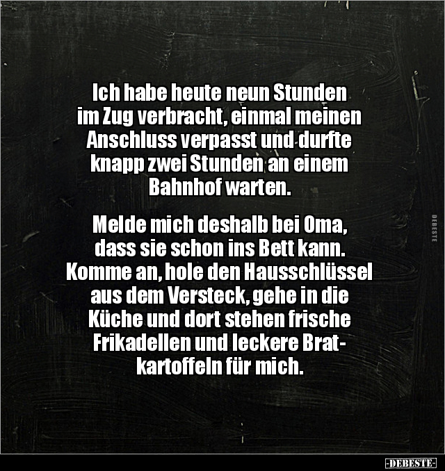 Ich habe heute neun Stunden im Zug verbracht, einmal meinen Anschluss verpasst und durfte knapp zwei Stunden an einem Bahnhof warten. Melde mich deshalb bei Oma, dass sie schon ins Bett kann. Komme an, hole den Hausschlüssel aus dem Versteck, gehe in die Küche und dort stehen frische Frikadellen und leckere Brat- kartoffeln für mich.