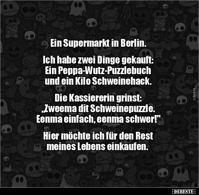 Ein Supermarkt in Berlin. Ich habe zwei Dinge gekauft: Ein Peppa-Wutz-Puzzlebuch und ein Kilo Schweinehack. Die Kassiererin grinst: „Zweema dit Schweinepuzzle. Eenma einfach, eenma schwer!" Hier möchte ich für den Rest meines Lebens einkaufen.