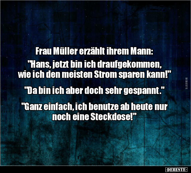 Frau Müller erzählt ihrem Mann: "Hans, jetzt bin ich draufgekommen, wie ich den meisten Strom sparen kann!" "Da bin ich aber doch sehr gespannt." "Ganz einfach, ich benutze ab heute nur noch eine Steckdose!"