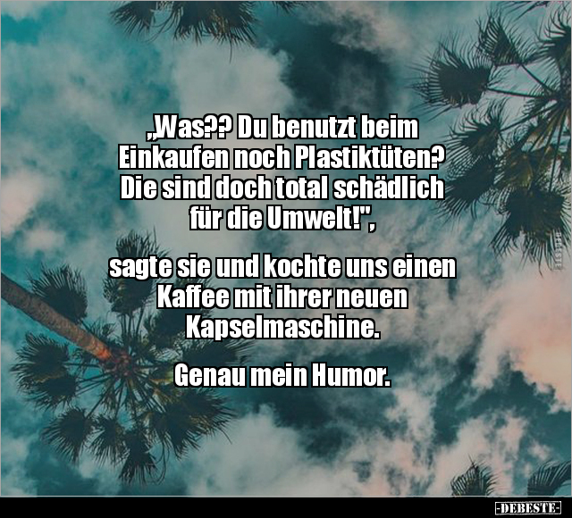„Was?? Du benutzt beim Einkaufen noch Plastiktüten? Die sind doch total schädlich für die Umwelt!", sagte sie und kochte uns einen Kaffee mit ihrer neuen Kapselmaschine. Genau mein Humor.