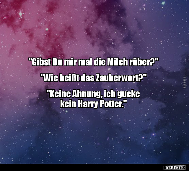 "Gibst Du mir mal die Milch rüber?" "Wie heißt das Zauberwort?" "Keine Ahnung, ich gucke kein Harry Potter."