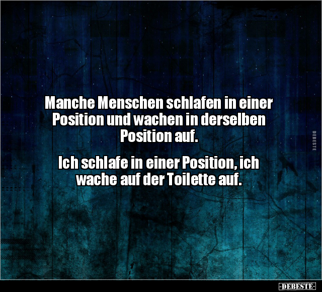Manche Menschen schlafen in einer Position und wachen in derselben Position auf. Ich schlafe in einer Position, ich wache auf der Toilette auf.