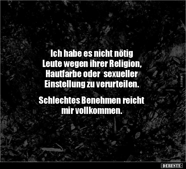 Ich habe es nicht nötig Leute wegen ihrer Religion, Hautfarbe oder sexueller Einstellung zu verurteilen. Schlechtes Benehmen reicht mir vollkommen.