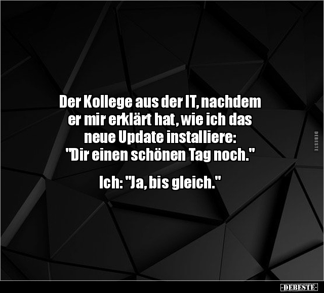 Der Kollege aus der IT, nachdem er mir erklärt hat, wie ich das neue Update installiere: "Dir einen schönen Tag noch." Ich: "Ja, bis gleich."