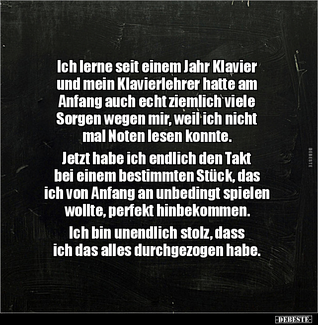 Ich lerne seit einem Jahr Klavier und mein Klavierlehrer hatte am Anfang auch echt ziemlich viele Sorgen wegen mir, weil ich nicht mal Noten lesen konnte. Jetzt habe ich endlich den Takt bei einem bestimmten Stück, das ich von Anfang an unbedingt spielen wollte, perfekt hinbekommen. Ich bin unendlich stolz, dass ich das alles durchgezogen habe.
