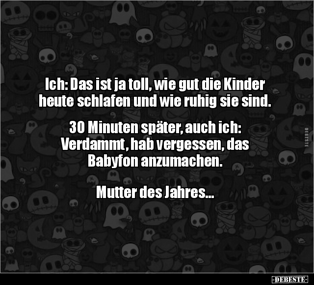Ich: Das ist ja toll, wie gut die Kinder heute schlafen und wie ruhig sie sind. 30 Minuten später, auch ich: Verdammt, hab vergessen, das Babyfon anzumachen. Mutter des Jahres...