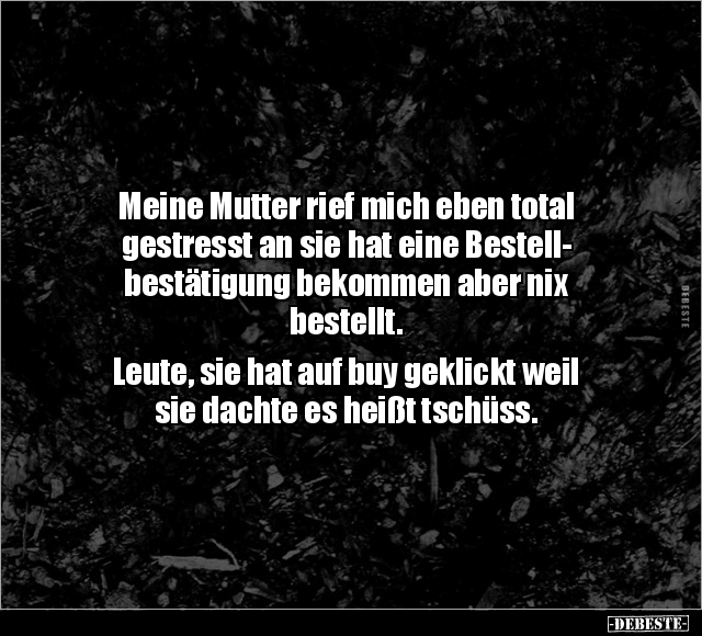 Meine Mutter rief mich eben total gestresst an sie hat eine Bestell- bestätigung bekommen aber nix bestellt. Leute, sie hat auf buy geklickt weil sie dachte es heißt tschüss.