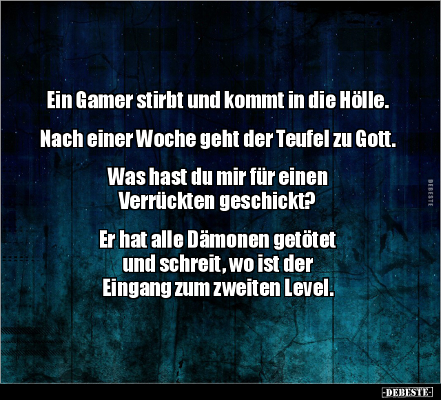 Ein Gamer stirbt und kommt in die Hölle. Nach einer Woche geht der Teufel zu Gott. Was hast du mir für einen Verrückten geschickt? Er hat alle Dämonen getötet und schreit, wo ist der Eingang zum zweiten Level.