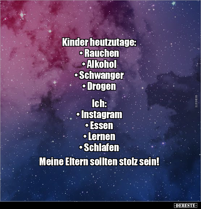 Kinder heutzutage: • Rauchen • Alkohol • Schwanger • Drogen Ich: • Instagram • Essen • Lernen • Schlafen Meine Eltern sollten stolz sein!