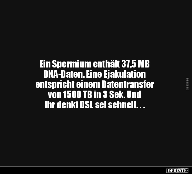 Ein Spermium enthält 37,5 MB DNA-Daten. Eine Ejakulation entspricht einem Datentransfer von 1500 TB in 3 Sek. Und ihr denkt DSL sei schnell. . .
