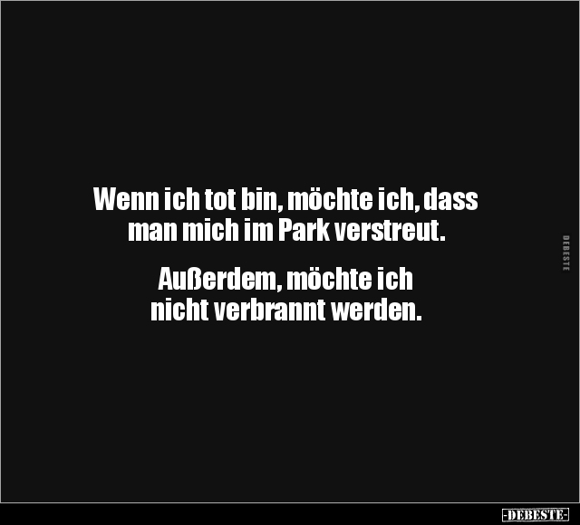 Wenn ich tot bin, möchte ich, dass man mich im Park verstreut. Außerdem, möchte ich nicht verbrannt werden.