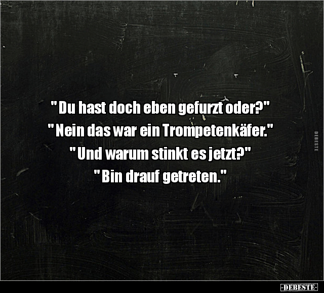 " Du hast doch eben gefurzt oder?" " Nein das war ein Trompetenkäfer." " Und warum stinkt es jetzt?" " Bin drauf getreten."