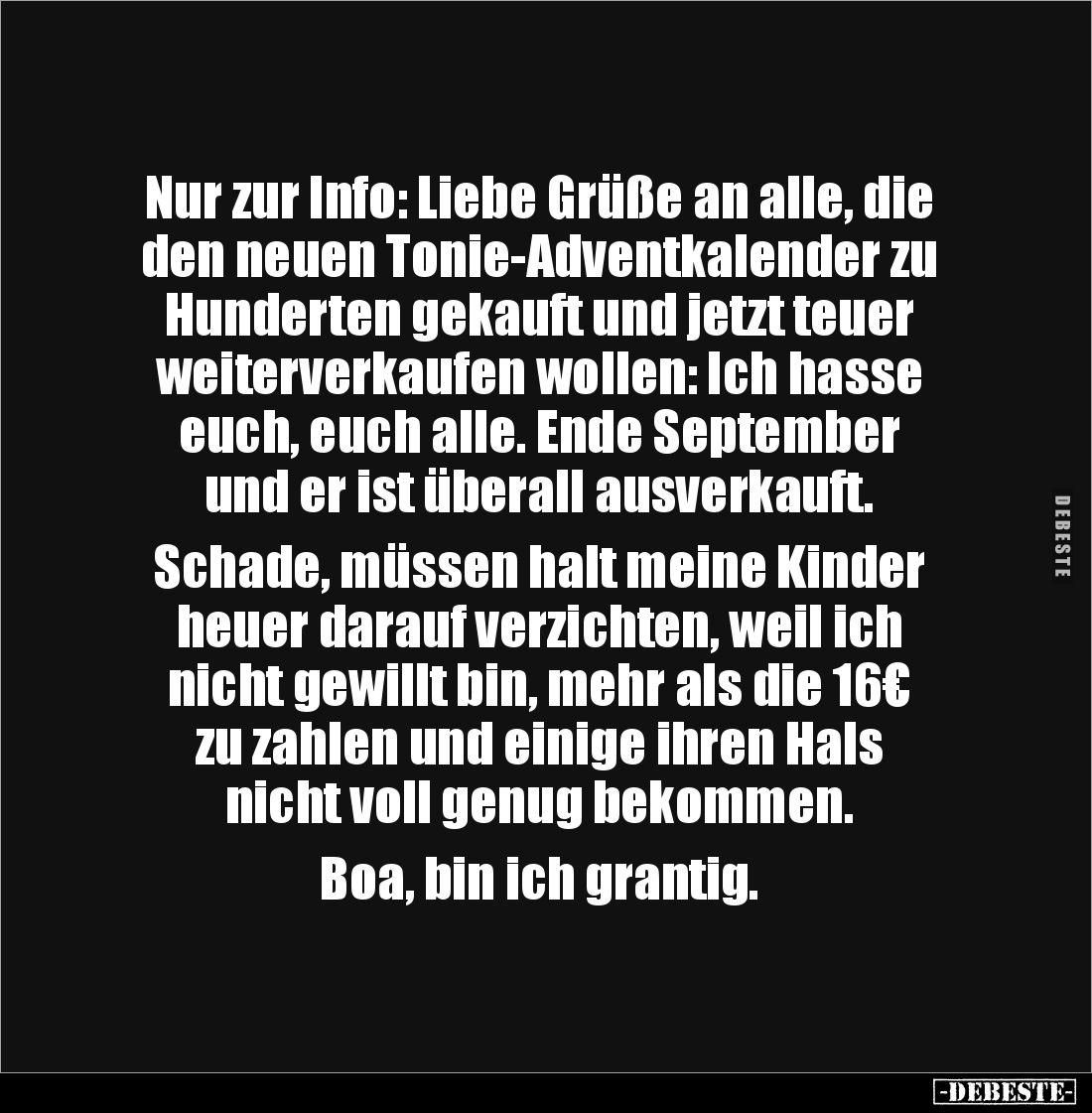 Nur zur Info: Liebe Grüße an alle, die den neuen Tonie-Adventkalender zu Hunderten gekauft und jetzt teuer weiterverkaufen wollen: Ich hasse euch, euch alle. Ende September und er ist überall ausverkauft. Schade, müssen halt meine Kinder heuer darauf verzichten, weil ich nicht gewillt bin, mehr als die 16€ zu zahlen und einige ihren Hals nicht voll genug bekommen. Boa, bin ich grantig.