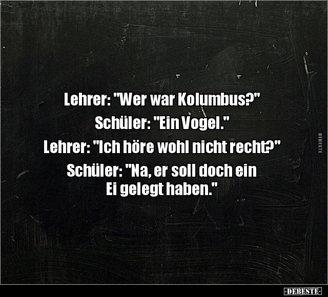 Lehrer: "Wer war Kolumbus?" Schüler: "Ein Vogel." Lehrer: "Ich höre wohl nicht recht?" Schüler: "Na, er soll doch ein Ei gelegt haben."