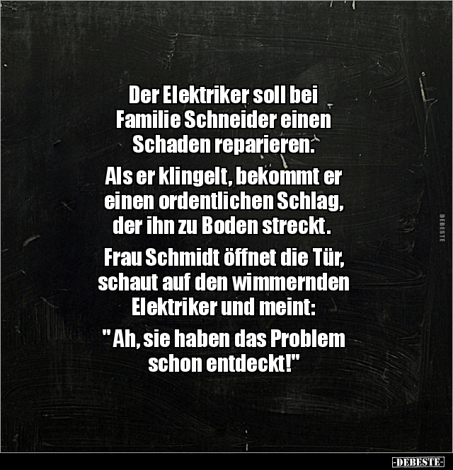 Der Elektriker soll bei Familie Schneider einen Schaden reparieren. Als er klingelt, bekommt er einen ordentlichen Schlag, der ihn zu Boden streckt. Frau Schmidt öffnet die Tür, schaut auf den wimmernden Elektriker und meint: " Ah, sie haben das Problem schon entdeckt!"