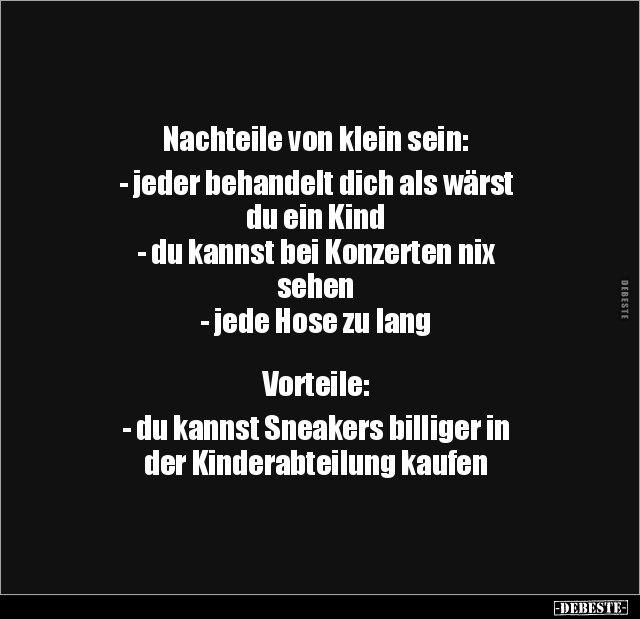 Nachteile von klein sein: - jeder behandelt dich als wärst du ein Kind - du kannst bei Konzerten nix sehen - jede Hose zu lang Vorteile: - du kannst Sneakers billiger in der Kinderabteilung kaufen