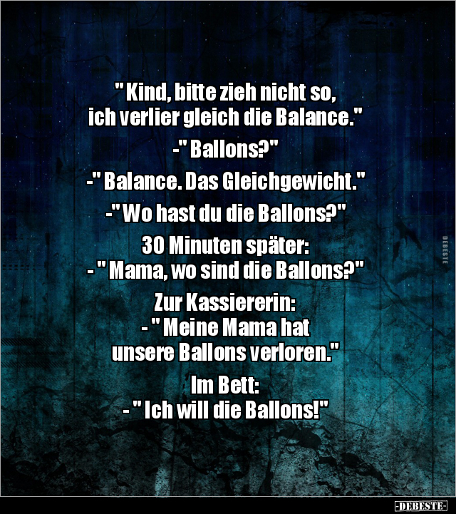 " Kind, bitte zieh nicht so, ich verlier gleich die Balance." -" Ballons?" -" Balance. Das Gleichgewicht." -" Wo hast du die Ballons?" 30 Minuten später: - " Mama, wo sind die Ballons?" Zur Kassiererin: - " Meine Mama hat unsere Ballons verloren." Im Bett: - " Ich will die Ballons!"