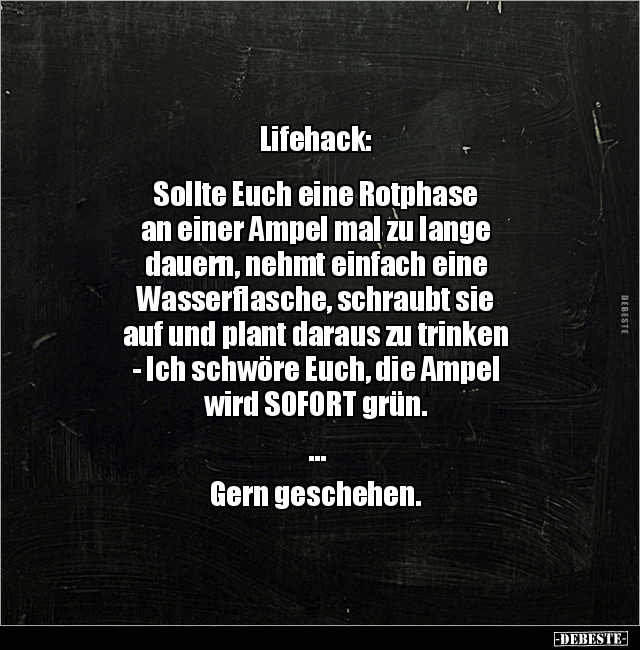 Lifehack: Sollte Euch eine Rotphase an einer Ampel mal zu lange dauern, nehmt einfach eine Wasserflasche, schraubt sie auf und plant daraus zu trinken - Ich schwöre Euch, die Ampel wird SOFORT grün. … Gern geschehen.