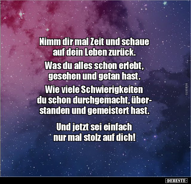 Nimm dir mal Zeit und schaue auf dein Leben zurück. Was du alles schon erlebt, gesehen und getan hast. Wie viele Schwierigkeiten du schon durchgemacht, über- standen und gemeistert hast. Und jetzt sei einfach nur mal stolz auf dich!