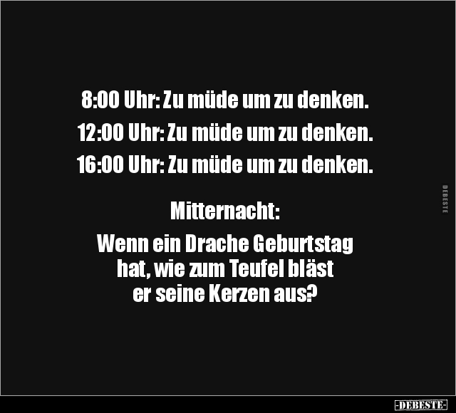 8:00 Uhr: Zu müde um zu denken. 12:00 Uhr: Zu müde um zu denken. 16:00 Uhr: Zu müde um zu denken. Mitternacht: Wenn ein Drache Geburtstag hat, wie zum Teufel bläst er seine Kerzen aus?