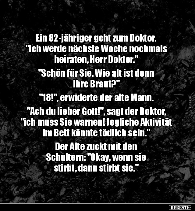 Ein 82-jähriger geht zum Doktor. "Ich werde nächste Woche nochmals heiraten, Herr Doktor." "Schön für Sie. Wie alt ist denn Ihre Braut?" "18!", erwiderte der alte Mann. "Ach du lieber Gott!", sagt der Doktor, "ich muss Sie warnen! Jegliche Aktivität im Bett könnte tödlich sein." Der Alte zuckt mit den Schultern: "Okay, wenn sie stirbt, dann stirbt sie."