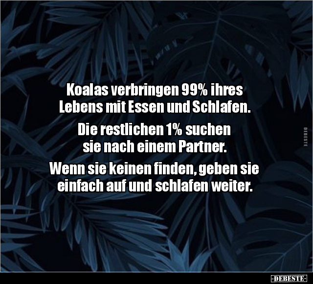 Koalas verbringen 99% ihres Lebens mit Essen und Schlafen. Die restlichen 1% suchen sie nach einem Partner. Wenn sie keinen finden, geben sie einfach auf und schlafen weiter.