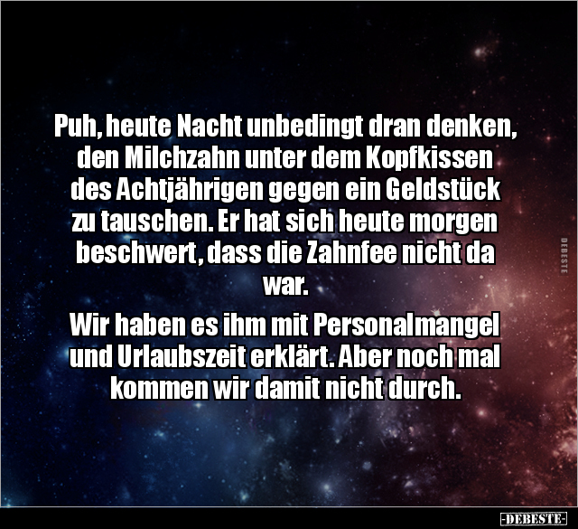 Puh, heute Nacht unbedingt dran denken, den Milchzahn unter dem Kopfkissen des Achtjährigen gegen ein Geldstück zu tauschen. Er hat sich heute morgen beschwert, dass die Zahnfee nicht da war. Wir haben es ihm mit Personalmangel und Urlaubszeit erklärt. Aber noch mal kommen wir damit nicht durch.