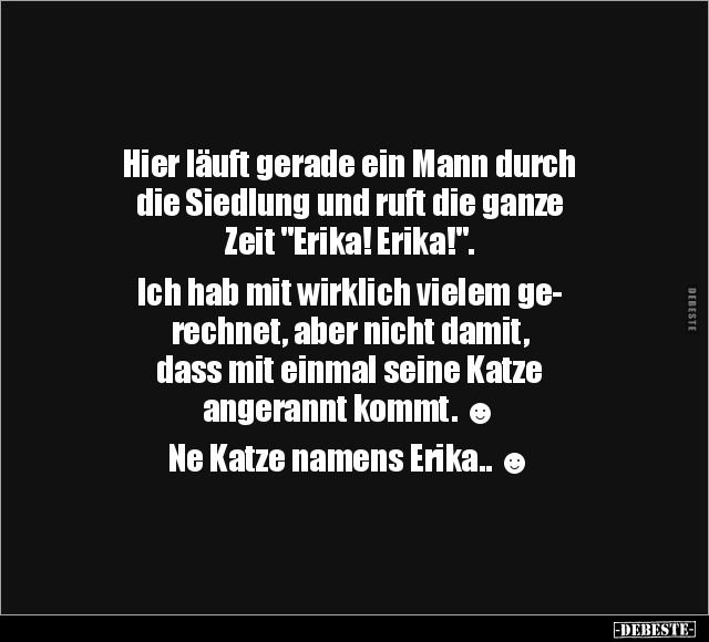Hier läuft gerade ein Mann durch die Siedlung und ruft die ganze Zeit "Erika! Erika!". Ich hab mit wirklich vielem ge- rechnet, aber nicht damit, dass mit einmal seine Katze angerannt kommt. ☻ Ne Katze namens Erika.. ☻
