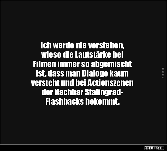 Ich werde nie verstehen, wieso die Lautstärke bei Filmen immer so abgemischt ist, dass man Dialoge kaum versteht und bei Actionszenen der Nachbar Stalingrad- Flashbacks bekommt.