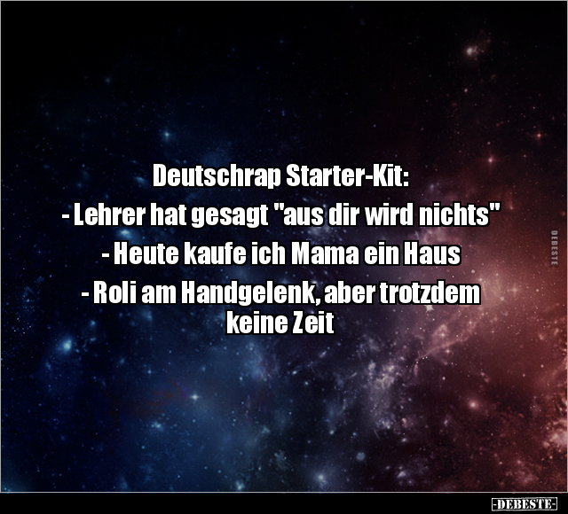 Deutschrap Starter-Kit: - Lehrer hat gesagt "aus dir wird nichts" - Heute kaufe ich Mama ein Haus - Roli am Handgelenk, aber trotzdem keine Zeit