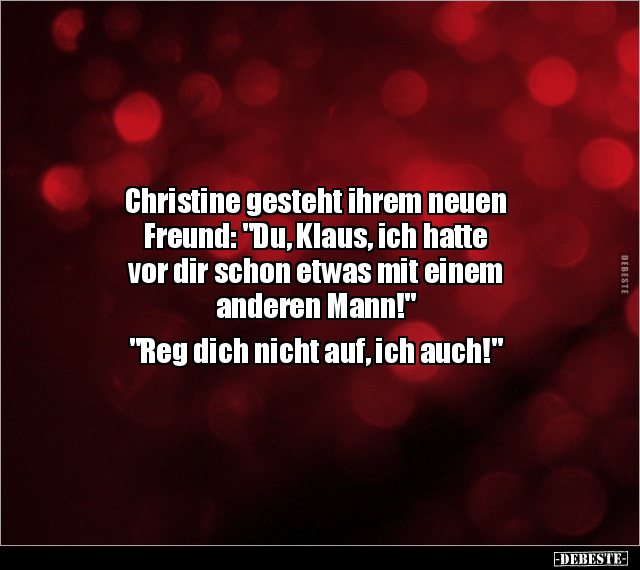 Christine gesteht ihrem neuen Freund: "Du, Klaus, ich hatte vor dir schon etwas mit einem anderen Mann!" "Reg dich nicht auf, ich auch!"