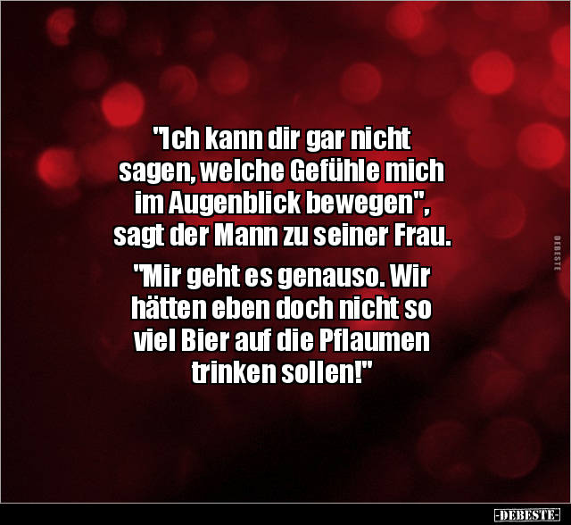 "Ich kann dir gar nicht sagen, welche Gefühle mich im Augenblick bewegen", sagt der Mann zu seiner Frau. "Mir geht es genauso. Wir hätten eben doch nicht so viel Bier auf die Pflaumen trinken sollen!"