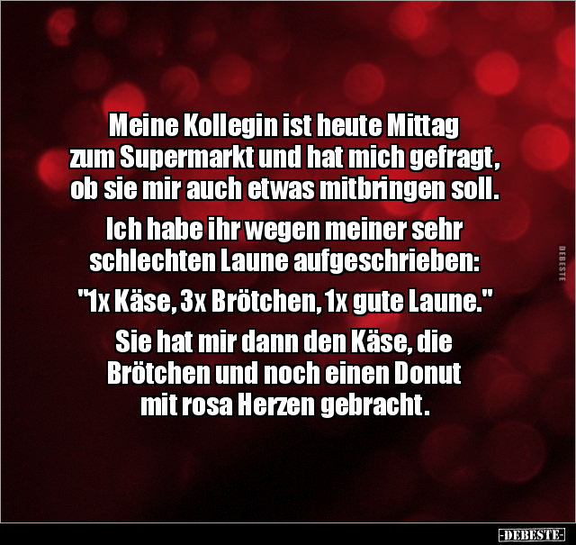 Meine Kollegin ist heute Mittag zum Supermarkt und hat mich gefragt, ob sie mir auch etwas mitbringen soll. Ich habe ihr wegen meiner sehr schlechten Laune aufgeschrieben: "1x Käse, 3x Brötchen, 1x gute Laune." Sie hat mir dann den Käse, die Brötchen und noch einen Donut mit rosa Herzen gebracht.
