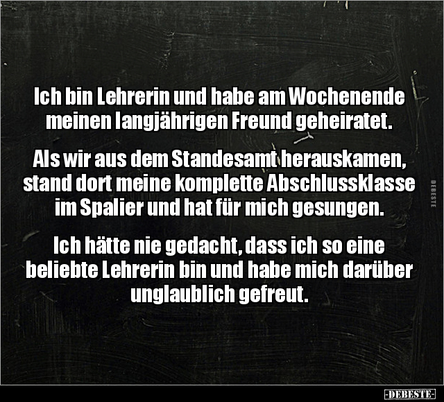 Ich bin Lehrerin und habe am Wochenende meinen langjährigen Freund geheiratet. Als wir aus dem Standesamt herauskamen, stand dort meine komplette Abschlussklasse im Spalier und hat für mich gesungen. Ich hätte nie gedacht, dass ich so eine beliebte Lehrerin bin und habe mich darüber unglaublich gefreut.
