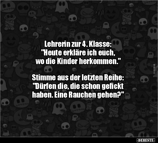 Lehrerin zur 4. Klasse: "Heute erkläre ich euch, wo die Kinder herkommen." Stimme aus der letzten Reihe: "Dürfen die, die schon gefickt haben. Eine Rauchen gehen?"