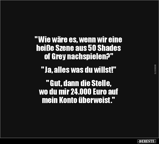 " Wie wäre es, wenn wir eine heiße Szene aus 50 Shades of Grey nachspielen?" " Ja, alles was du willst!" " Gut, dann die Stelle, wo du mir 24.000 Euro auf mein Konto überweist."