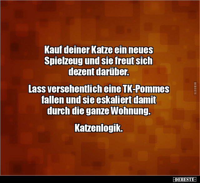 Kauf deiner Katze ein neues Spielzeug und sie freut sich dezent darüber. Lass versehentlich eine TK-Pommes fallen und sie eskaliert damit durch die ganze Wohnung. Katzenlogik.
