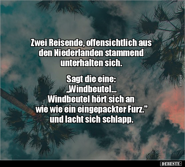 Zwei Reisende, offensichtlich aus den Niederlanden stammend unterhalten sich. Sagt die eine: „Windbeutel... Windbeutel hört sich an wie wie ein eingepackter Furz." und lacht sich schlapp.