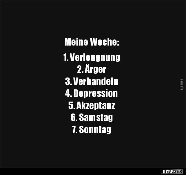 Meine Woche: 1. Verleugnung 2. Ärger 3. Verhandeln 4. Depression 5. Akzeptanz 6. Samstag 7. Sonntag